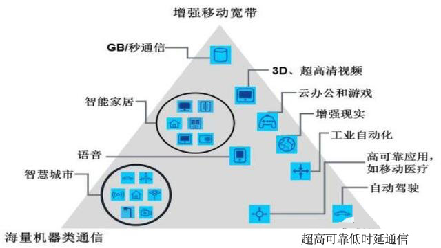 国际电信联盟ITU在2015年定义了5G三个主要应用场景:增强型移动宽带(eMBB)、大连接物联网(mMTC)及低时延高可靠通信(uRLLC)。根据未来移动通信论坛发布的《5G白皮书》,从信息交互对象不同的角度划分,其中eMBB场景是指在现有移动宽带业务场景的基础上,对于用户体验等性能的进一步提升,主要还是追求人与人之间极致的通信体验,对应的是3D/超高清视频等大流量移动宽带业务;mMTC和uRLLC则是物联网的应用场景,但各自侧重点不同:eMTC主要体现物与物之间的通信需求,面向智慧城市、环境监测、智能农业、森林防火等以传感和数据采集为目标的应用场景;uRLLC应用对时延和可靠性具有极高的指标要求,面向如车联网、工业控制等垂直行业的特殊应用需求。